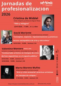 Las Jornadas de Profesionalización del Máster MUPIA se han desarrollado a lo largo de este curso. En la primera conferencia (22/01/2026) contamos con la presencia de la artista Cristina de Middel. Galardonada con el Premio Nacional de Fotografía en 2017, comisaria de PhotoEspaña en 2018, en 2024 ha recibido la Medalla al Mérito de las Bellas Artes y el Premio Princesa de Asturias de la Concordia 2024 como presidenta de la Agencia Magnum Photos. Para esta ocasión nos presentó su trabajo “Vida y milagros” centrado en sus proyectos artísticos en los que explora los límites entre la realidad y la ficción.